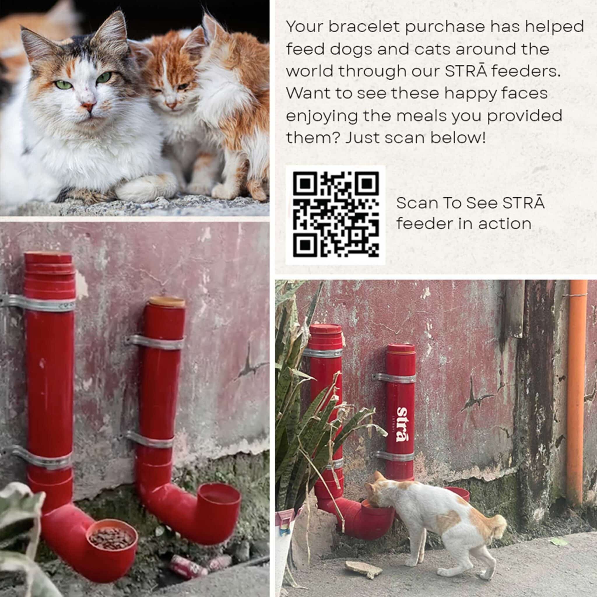 You'll also receive a QR code to see the animals enjoying the meals from your assigned STRĀ street feeder. Make a difference and witness your generosity in action!